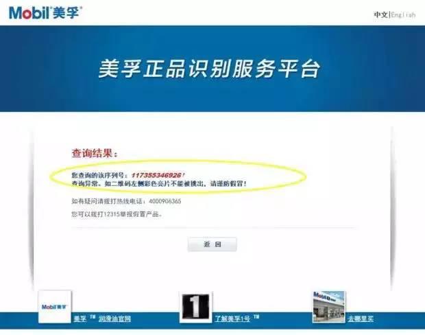 若您连续扫描几次,会出现错误提示,按照我们沟通美孚得到的回答,若连续查询10次,就会提示查询异常。