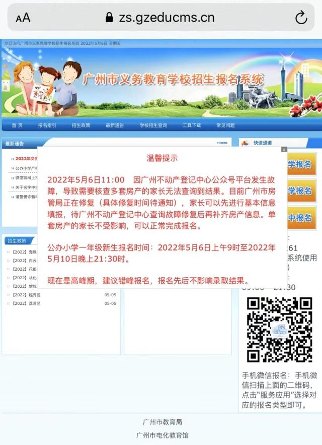 广州市教育局官网也发出了温馨提示:5月6日11:00,因广州不动产登记中心公众号发生故障,导致需要核查多套房产的家长无法查询到结果。目前,广州市房管部门正在修复,家长可以先进行基本信息填报,待广州市不动产登记中心查询故障修复后再补齐房产信息。单套房产的家长不受影响,可以正常完成报名。