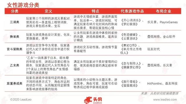 “女性向游戏”这几年都是国内游戏圈热词,《中国女性游戏行业概览》提到一线城市女性的移动端游戏渗透率突破50%,并指出“女性游戏”可分成三消类、换装类、宫斗冒险类、乙女类、放置养成类,其中后三类“数量较少、前景广阔”。