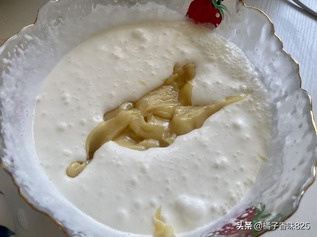 5、用电动打蛋器搅拌淡奶油,稍微有点浓稠,就把奶糖酱也倒入淡奶油中,继续打发至浓稠,而且还可以流动的状态,也不要打发得太干,口感就没有那么丝滑了,冰淇淋液就做好了。
