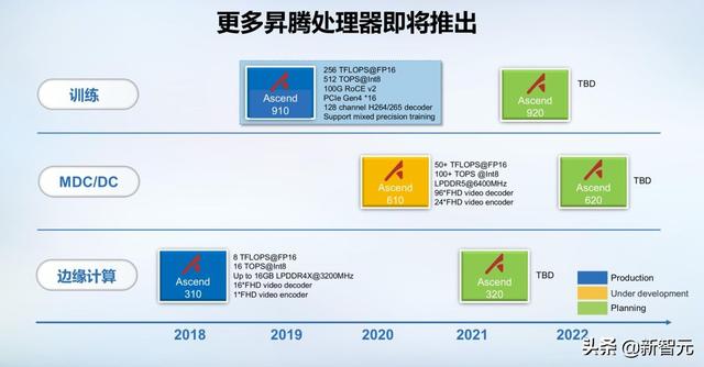 上面是昇腾处理器的一系列计划时间表,可以看到,该系列芯片覆盖训练、MDC/DC、边缘计算多种场景,即将在2021年推出用于训练场景的昇腾920,边缘计算场景的昇腾320.