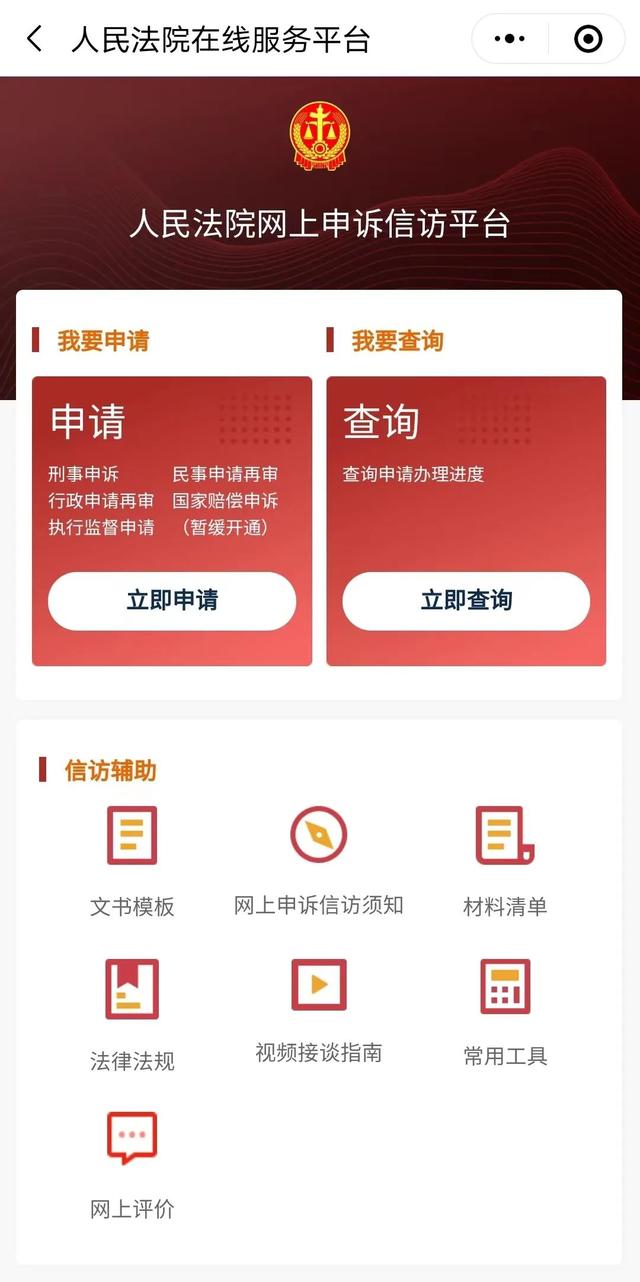 登录微信小程序,注册认证后即可通过“网上信访”板块进行在线信访,在人民法院网上申诉信访平台,点击“我要申请”可以进行不同类型案件的申诉信访申请,也可以点击“我要查询”,查询已经提交申请的申诉信访办理进度,减少申诉信访当事人在疫情防控期间出行的不便。