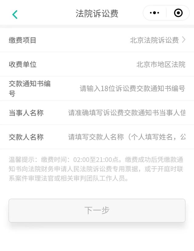 缴费项目选择“北京法院诉讼费”。依次输入“诉讼费交款通知书”上面的“交款通知书编号”、“当事人名称”、“交款人名称”,点击“下一步”即可进行缴费。
