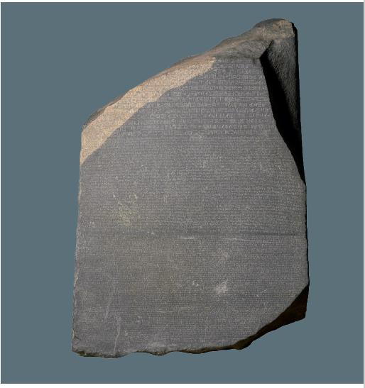 罗塞塔碑是一块公元前 196 年制作的大理石断碑,原本是一块刻有埃及国王托勒密五世(Ptolemy Ⅴ)诏书的石碑。石碑最上面刻的是古埃及的圣书体文字,中间是古埃及的世俗体文字,下面是刻了同样内容的希腊文字。这就是解开古埃及 象形文字的钥匙,因而也成为大英博物馆的镇馆之石。在古埃及的文物 上,人们发现圣书体随处可见,就是因为这块石碑,人们才可以读懂这些圣书体,由此可见这块石碑的重要性了。