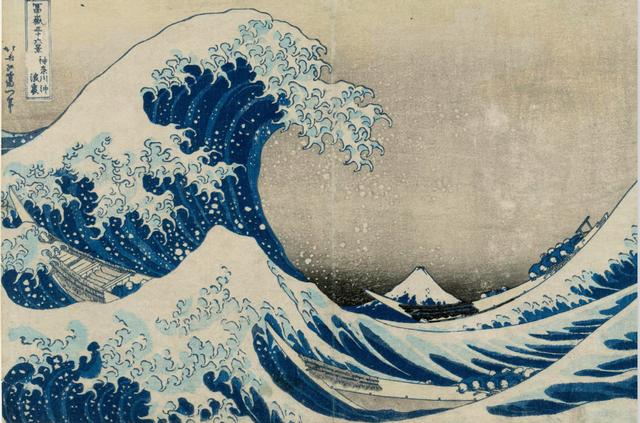 除了中国古画,大英博物馆还收藏了日本名画《神奈川冲浪里》。《神奈川冲浪里》是日本浮世绘画家葛饰北斋(Katsushika Hokusai)的代表作品。画家突出了绘画的主要对象—浪涛,让巨大的浪涛占据了主要画面,形成常用数学去刻画的冲击波。狰狞的浪头似乎要吞噬一切, 浪谷里有条小船正在挣扎,船工的整齐用力也表明了人们正奋力与大浪抗衡。有意思的是,浪谷里出现富士山的轮廓,高大的富士山在大浪的映衬下似乎弱不禁风。画面是经典的浮世绘风格,细腻简洁的描绘却气势磅礴、气象万千,充满哲理和深刻的寓意。