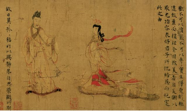 作品描绘几个女子典范的故事,如汉代冯媛以身挡熊,保护汉元帝;再如班婕妤拒绝与汉成帝同辇,以防成帝贪恋女色而误朝政等。作品蕴涵了当时妇女应遵守的道德信条以及描绘了当时上层妇女的日常生活,真实而生动地再现了贵族妇女的娇柔、矜持、典雅端庄。画中人物形神兼备,色彩明丽、秀润。画家用笔精细连绵,如“春蚕吐丝”,韵味无穷。1860年“火烧圆明园”后,这幅珍品被掠夺而流失海外,现收藏于大英博物馆。北京故宫博物院另藏有宋代摹本。