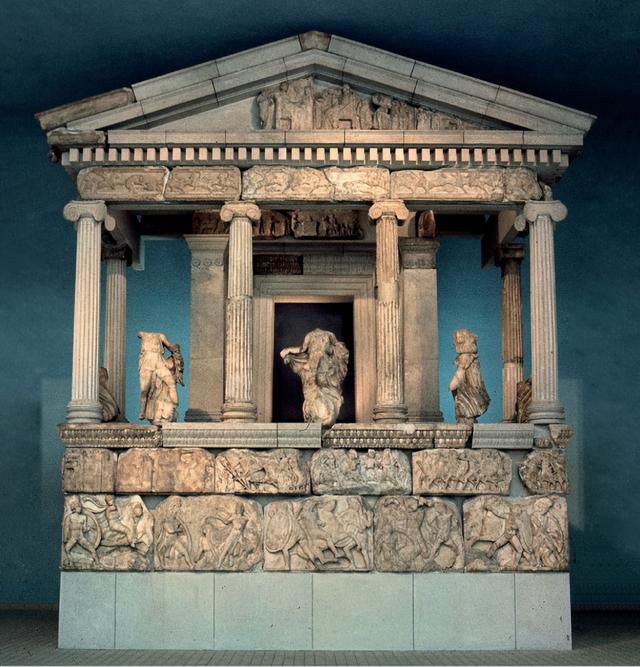 古希腊和古罗马文物涅瑞伊得斯纪念碑(Nereids Monument)因其外形又被称为“海 仙女神庙”,它是希腊 - 波斯和吕基亚(Lycia)当地风格的完美结合。 它出土于土耳其西南的克桑托斯(Xanthus)古城,古城在古希腊时期 是吕基亚的都城,据说神庙是为当时的统治者阿比纳斯(Arbinas)所建。 英国人于 1848 年对古城进行了发掘,将许多文物带回英国,其中已毁坏的海仙女神庙被整体搬迁并在大英博物馆重建。这样,海仙女神庙便成 为保存最好的古希腊时期神庙,同时在大英博物馆展出。海仙女神庙深受当时希腊流行的爱奥尼亚式风格的影响,因此推测其设计者和雕刻师 都为当时的希腊人。
