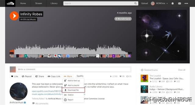 下载方式稍微复杂一点,推荐的方式是点击右侧的「云朵」下载标志,选择通过艺术家主页下载,点击后会进入 SoundCould 网站内。在音乐下方的「more/更多」-「download file/下载文件」就可以将音乐下载到本地了。(第一次进入 SoundCould 网站需要注册登录)