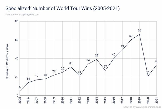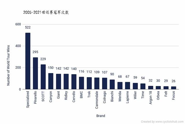 2005年-2021年,大大小小的比赛包括环法、环意、环西班牙以及各类大大小小一日经典赛加起来有2500多场。以下是各项数据统计获得冠军次数最多的自行车品牌。