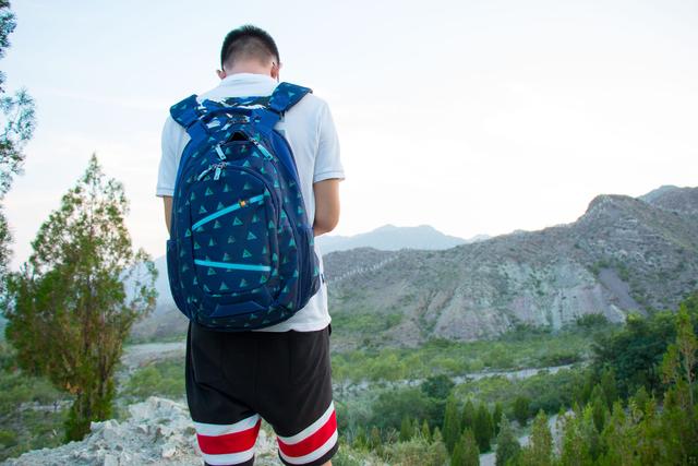 背包规格尺寸为高43×宽30×厚31cm,自重820g。从外观看确实没有看出它会如此轻便。小编拿到的这款双肩包为藏蓝色搭配三角几何体花纹,较为休闲百搭。外侧两个撞色斜杠装饰条,打破原有整体传统的包体设计,使整个设计顿时突出时尚气息。除了这款藏蓝色以外,还有绿色、紫色、黑绿、黑色等都搭配有不规则的几何印花,无不突出时尚百搭的风格。