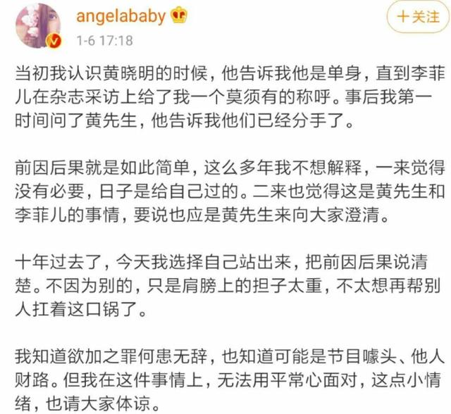 由于那段话里的“黄先生”三个字实在是太见疏离,以至于外界开始纷纷猜测俩人是不是离婚了的时候,黄晓明的微博来了,他表示:Baby不是小三!