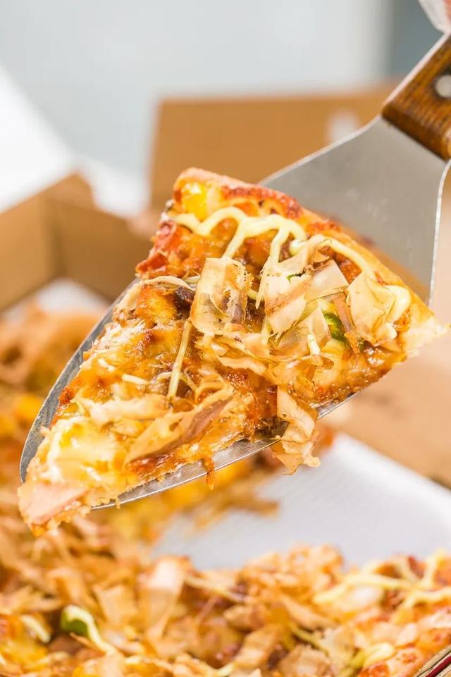 加入了奥尔良鸡肉、香烤火腿片、玉米、青椒丁等超多码料。出炉后的饼皮吸足了肉香,外衣酥脆,一块块叠加起来的厚度比汉堡包的还要足!
