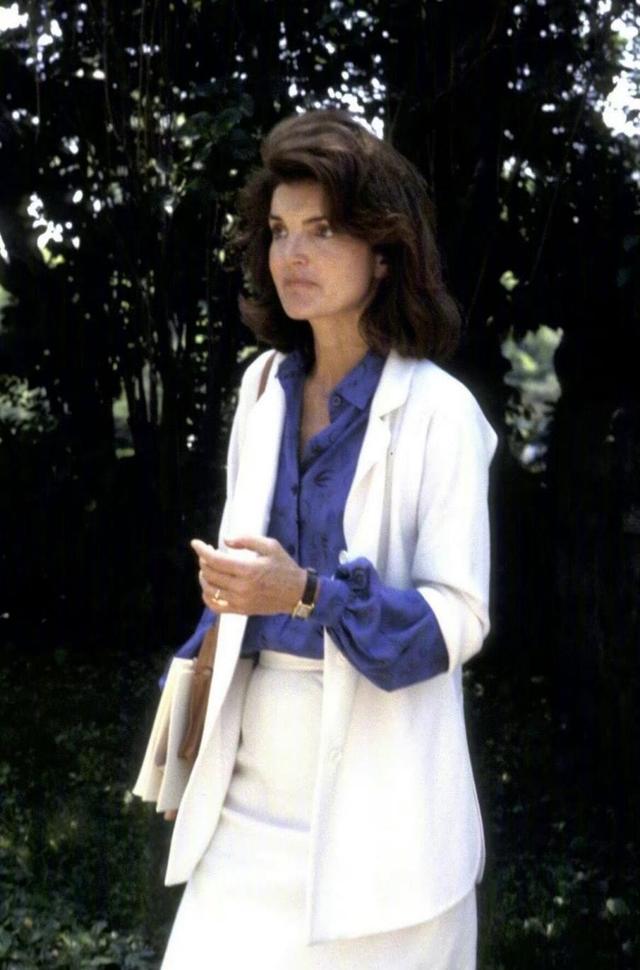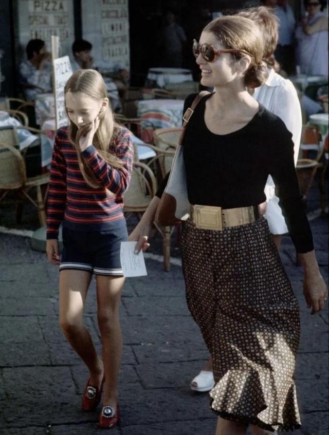 看杰奎琳的穿搭,不仅仅能感受到贵妇人的轻奢娇贵,还有一种轻松愉悦,宁静质朴的高级萦绕心间。这套Look直至今日依旧被大家争相模仿。一件黑色衬衫,将扣子解开,并将袖口挽上去,用随意的细节打破极简衬衫的古板,自然流动的慵懒之美纷至沓来,下装选择一件卡其色的高腰半裙,天然的亚麻面料还保留着返璞归真的压痕,为着装注入浓郁的复古力量,让人赏心悦目。腋下包、蓬松的卷发、帅气的墨镜,这些也都是时髦发力点,虽为配角,但时尚力不能忽略。