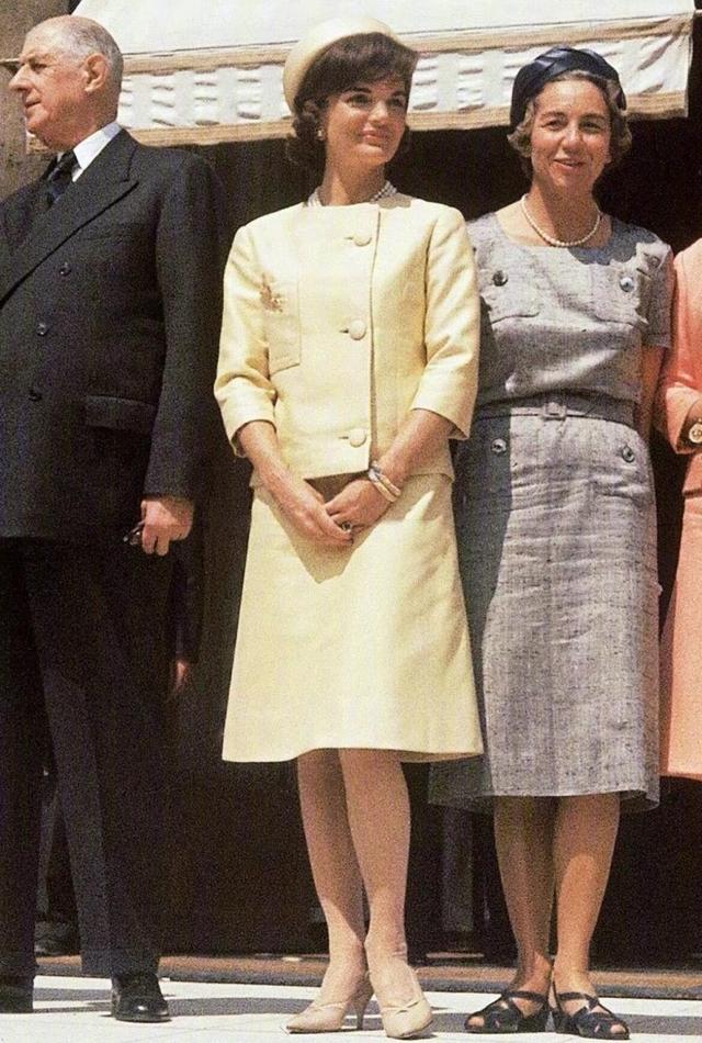 杰奎琳很喜欢在隆重的场合穿套装,表达一份得体庄重。奶黄色的短款外套+同色系的直筒半裙,典雅大气又不失温柔,小香风套装的优雅华贵从不会让人失望。同色系本就将显高显瘦演绎到极致,再配合上短款外套自动画出的腰线,整个人的身材比例瞬间变成三七分。