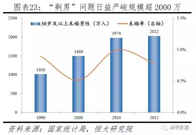 出生人口性别比1982年开始逐渐失衡,特别是在1990-2010年期间一度超过120;“剩男”问题日益突出,2015年已超2000万,其中超过一半在农村,9成为初中及以下学历,到2040年“剩男”规模或达约4000万。