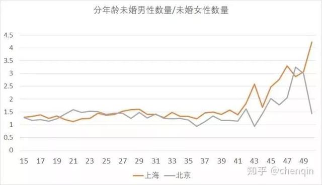 基于2015年1%人口抽样数据,上图展示了北京和上海分年龄的未婚男性和未婚女性的数量比。在绝大多数情况下,这一比值都大于1。换句话说,在几乎所有年龄上,这两个一线城市的未婚男性数量都是高于未婚女性的。以上海为例,从25岁开始直到40岁,未婚男性数量平均要比同龄未婚女性多出50%左右;在40岁之后,未婚男性数量约是同龄未婚女性的2-4倍。