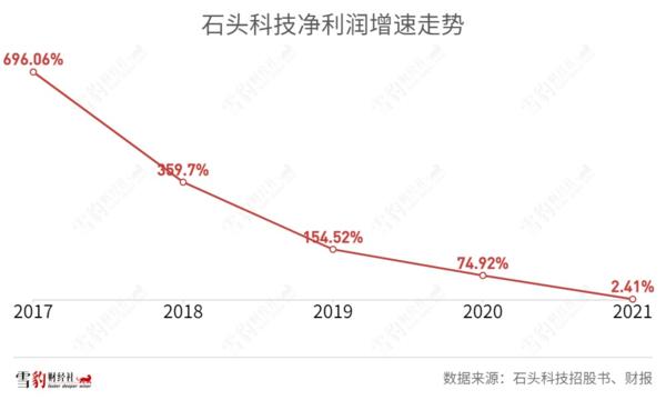在石头科技“去小米化”的几年里里,首先增长的是其毛利率,从2016年的19.21%增长至2020年的51.32%。尽管看起来实现了其最初的计划,但是可以见到的是,但在去小米化后,毛利率的升高带来的却是净利润增速的下降。石头科技的净利润增速已从2017年的696.06%降至2021年的2.41%。