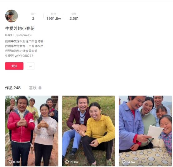 一年时间不到,牛爱芳的小春花已经是接近2000万的网红大V,甚至成为短视频平台头部账号。