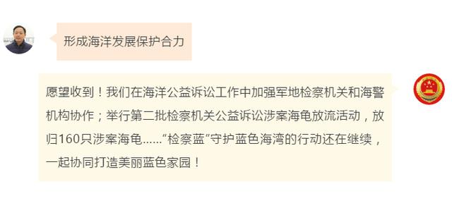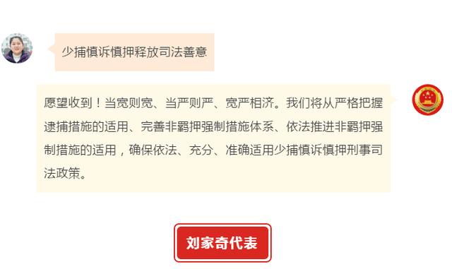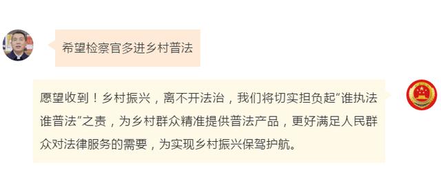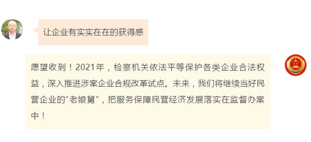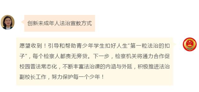 “建议创新未成年人法治宣教方式”“希望检察官多进乡村普法”“让企业有实实在在的获得感”……近日,全国人大代表袁晶、柴闪闪、权太琦、刘家奇、陈国鹰、邵志豪、张立祥视频出镜“对话最高检”在线许愿,提出了自己对检察工作的期望,收到@最高人民检察院 的微博回复。