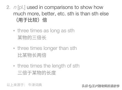 2. 字典里都是支持教材的。其实在这里,我要多说那么几句。牛津高阶字典也是不断改版的。好像是在第7版或更早的字典解释里,three times more than 就解释为“多三倍、是四倍”。我身边已经找不到老版本的字典了,但清晰记得以前是这么解释的。