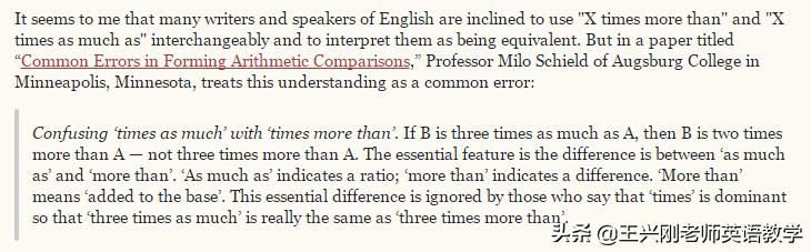 这一段的核心在说:有一个叫Milo Schield的学者,认为more than不是“ratio”,而是“difference”,more than是在原数上再加出来的。所以,three times more than要理解成“多三倍、是四倍”。