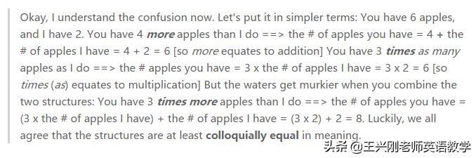 当然这个解释,更加的简单明了、通俗易懂。观点也支持three times more than是“多三倍、是四倍”的意思。