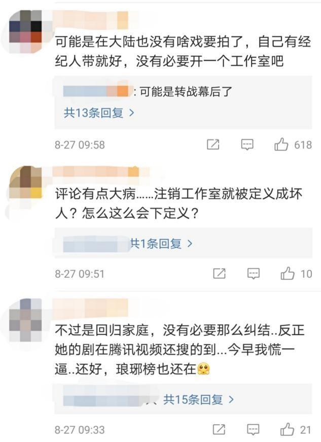 网友对于林心如注销工作室的原因众说纷纭,但大部分人对她还是表示理解,有网友认为:“可能是转战幕后了”,并解释道:“在大陆没什么戏要拍,自己经纪人带就好”,也有网友猜测她是“回归家庭。”