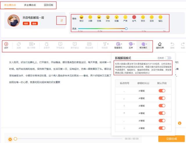 在编辑页面,支持影视解说模式、自定义背景音、特效音、变声、调节语速、智能断句、多音字纠错、多人对话、主播切换....等功能。
