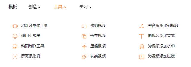 “工具”模块的话,主要是幻灯片制作、表情包生成、GIF生成、屏幕录制、裁剪视频、合并视频、压缩视频、视频格式转换.....等功能。