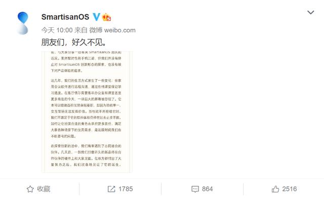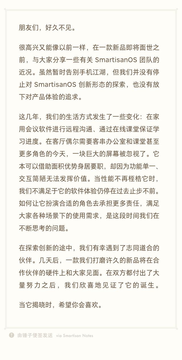 SmartisanOS团队表示:“虽然暂时告别手机江湖,但我们并没有停止对SmartisanoS创新形态的探索,也没有放下对产品体验的追求。”