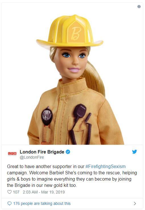 伦敦消防局发推文说:“欢迎芭比娃娃加入消防队,她将投身于消防事业,帮助女孩和男孩拓展思路,尽情设想今后自己能从事什么样的工作。”
