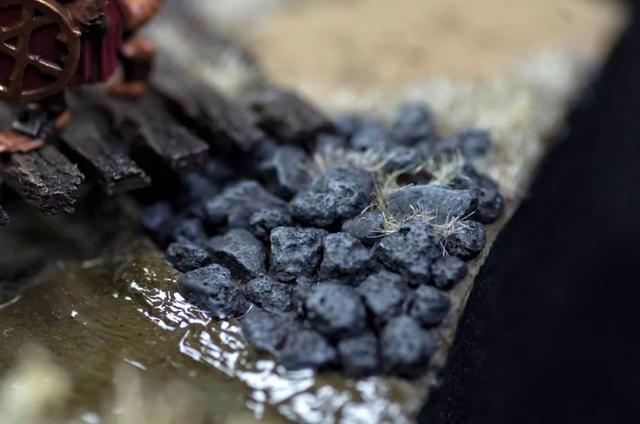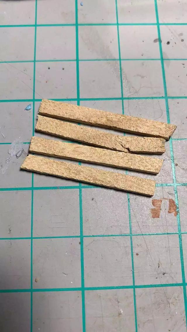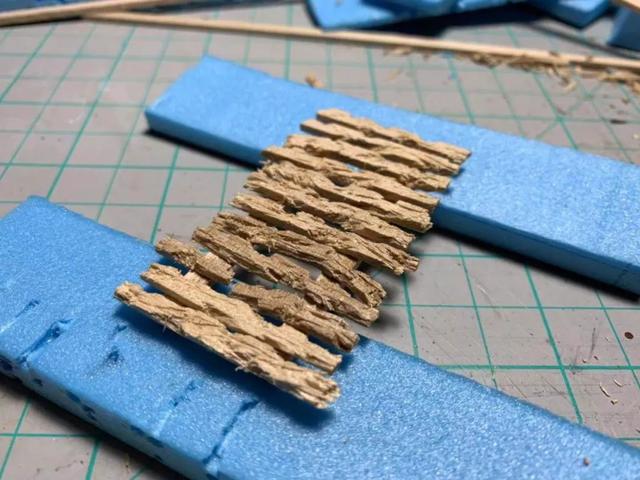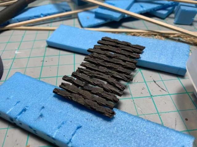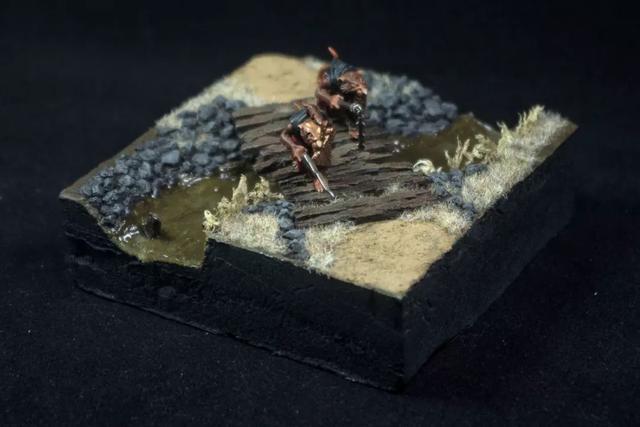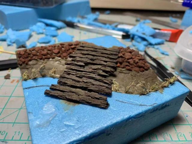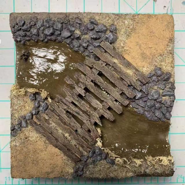 场景里最主体的道具算是中间的木桥了,用木条直接制作,根据设计好的尺寸,切成一小段一小段,并加以摧残,突出战锤世界的环境是处于战争残破的。做出本体就开始上色,上色的步骤相对简单,底色、渍洗、干扫,都是基础点手法,但是效果比较显而易见。