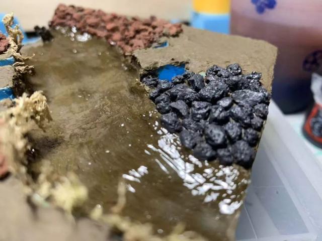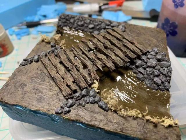 做好木桥这个道具,就可以开始做底盘了。挖出河道填上泥,趁泥没干之前,给一边河岸铺上石头,大小参差,另一半落差比较大的河岸粘一些干草。等河道的泥干透,就开始做水,水景膏这个东西,要一层干一层铺,慢慢上,不过第一次用,把握的不是很好。