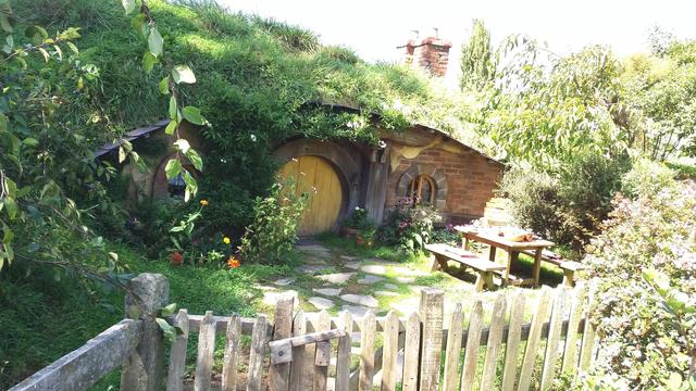 霍比特村自然风光确实秀美,山坡铺满绿草,古树参天,野花遍布,湖泊明净,山间小道,小桥流水,霍比特人居住的半圆形地洞木屋,实可用如诗如画去形容,让人感觉进入了世外桃源一般。