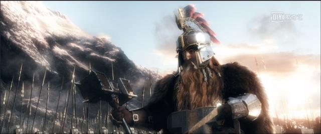 丹恩二世矮人部队节节败退,被打得都退到了城下,此时醒悟过来的索林带着十二名矮人杀出,给矮人提起气势,从正面刚半曾人军队。