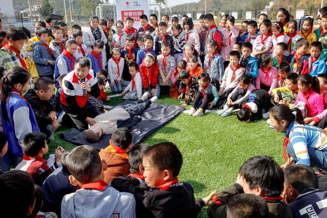 在湖北英山开展“博爱校园健康行动”,校医为同学们讲解心肺复苏术等应急救护知识