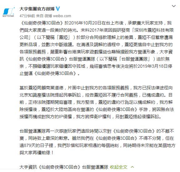 近日,大宇集团分别在《仙剑奇侠传3D回合》台服官网及集团微博发表声明文章,称因游戏研发商深圳盖娅科技违约行为,已向北京市知识产权法院发起对盖娅科技的侵权诉讼,且《仙剑奇侠传3D回合》台服将于3月18日正式停运,目前该案件已被受理将择期开庭。