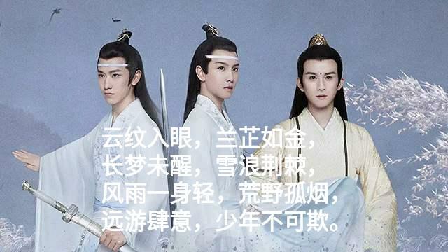 “云纹入眼,兰芷如金,长梦未醒,雪浪荆棘,风雨一身轻,荒野孤烟,远游肆意,少年不可欺。”