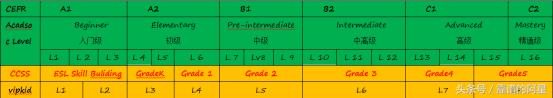 (欧洲CEFR体系与美国CCSS体系的对比,其中CEFR语音等级比CCSS多一倍、相应的课程考试也更多,其中阿卡索是每4门课程一次考试,CCSS适用于美国各州的平均水平,而CEFR采用最严格的语言标准,适用于全球通行)