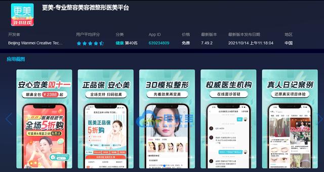 更美APP隶属于北京完美创意科技有限公司,创建于2013年。更美App是一个整形交流社区,也是一个医美电商平台。为用户提供整形、微整形、口腔、眼科、抗衰老等服务,还能在社区内与其他用户分享变美体验,接受医生一对一的网上面诊咨询与服务。