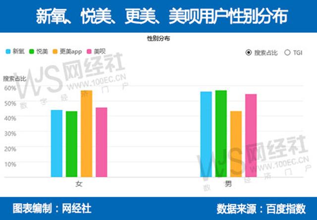 在用户性别分布上,除了更美的女性群体比例高于男性外,新氧、悦美以及美呗的男性关注群体比例均高于女性群体。这或许也暗示着男性颜值经济正在崛起。