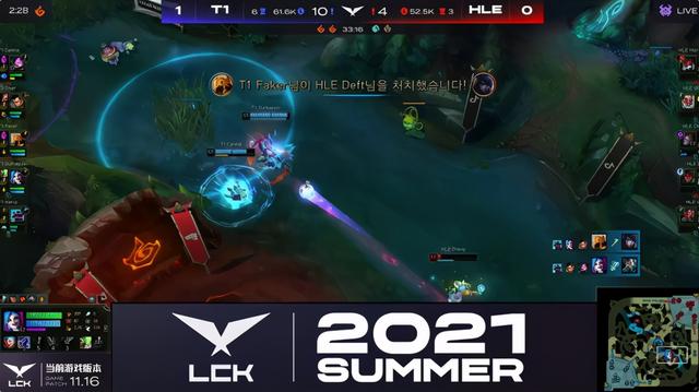 第一局前期T1由于阵容的问题,所以他们也是选择放掉小龙资源,为自己的双C争取更多的发育时间,HLE的战术其实很简单,由于中下手比较长,完全可以拿到线权,打一个前期下半区节奏,然而计划赶不上变化,HLE的上路在前期直接被穿线了,导致的结果就是前期制定的战术方案全乱了,峡谷先锋没了,下路也被T1掌握了线权,当比赛来到中期之后,Faker的卡萨丁成为了赛场上的大魔王,31分钟李哥用双金身勾引成功,T1成功在中路打出HLE团灭,拿下大龙buff,携带着大龙buff,T1也是成功拿下首局。