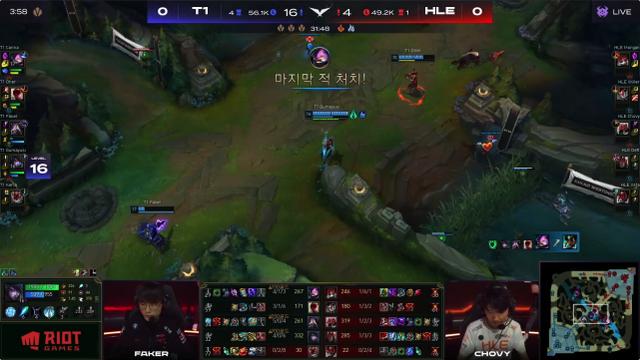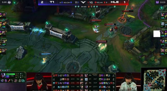 进入第三局后HLE下路在前期直接被gumayusi对线完成1换2双杀,之后的峡谷先锋团又被T1打出0换1,先锋被T1拿下,随后HLE的中下两路漏洞越来越大,不过在这种关键时刻,在chovy的带领下,连续几波的小规模团战将局势给扳了回来,虽然上路这个点确实有差距,但HLE在击杀了cnana后,一波双TP野区后完成了对T1的包围打赢团战,HLE成功拿下大龙buff,随后HLE又拿下火龙魂直逼T1高地,后续T1可以说是搏命的几波团都没有取得什么效果,最终也是被HLE成功一波。