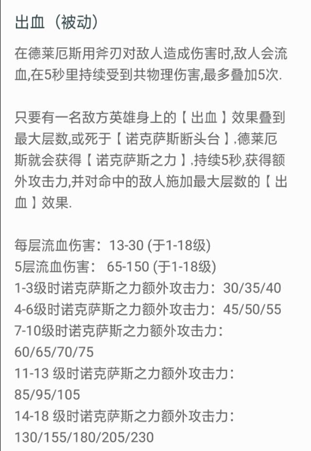 诺手的被动技能能够造成流血效果,更为重要的是,在叠加5层后,能够获得高额的攻击力,随英雄等级而增加,在一级便拥有30点攻击力加成,18时更是高达230点。