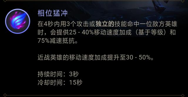 相位猛冲提供的高额移速,在诺手没有疾跑与闪现时,能够很好的增强其机动性。