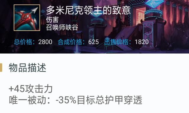 多米尼克的致意拥有35%的护甲穿透,诺手的E技能被动同样拥有35%的护甲穿透,相当于诺手自带了一件穿甲最高的装备。