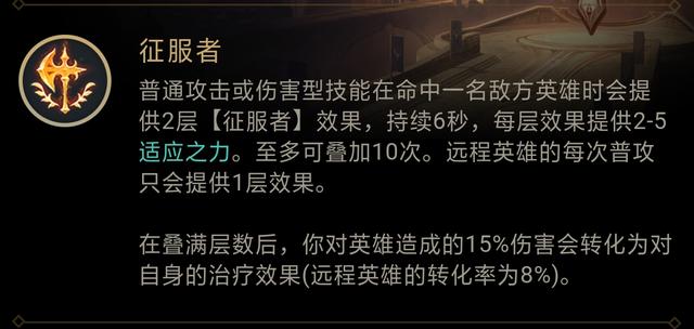 征服者的效果显而易见,直接增加攻击力,在叠满后,获得百分比伤害转化治疗量,提升了持续作战能力与回复能力。