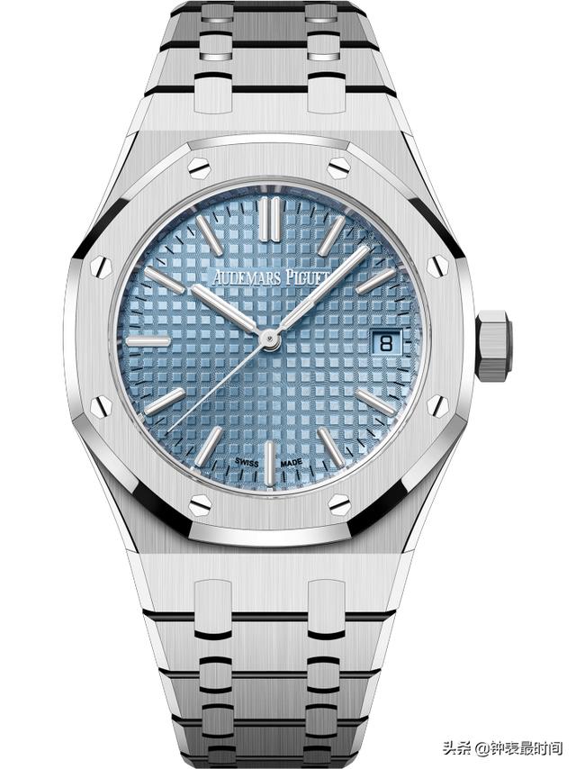 这款37毫米精钢腕表,厚度仅有9毫米,采用全新Royal Oak皇家橡树设计风格,浅蓝色表盘镌刻“Grande Tapisserie”大格纹装饰,搭配白金荧光立体时标和皇家橡树指针。腕表搭载全新Calibre 5900自动上链机心,配备“50周年”纪念版铑色玫瑰金自动摆陀。精钢表壳,搭配防眩光处理蓝宝石水晶玻璃表镜和表底。
