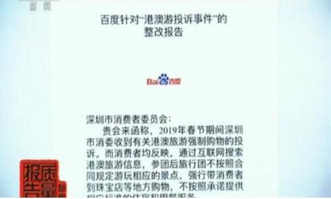 专项测试调查结束后,深圳市消费者委员会召开港澳游“野马”旅行社投诉调查情况通报会,消费者通过百度搜索广告报名港澳游“野马”旅行社上当被骗,深圳市消委会依据《消费者权益保护法》向百度公司发送监督函。