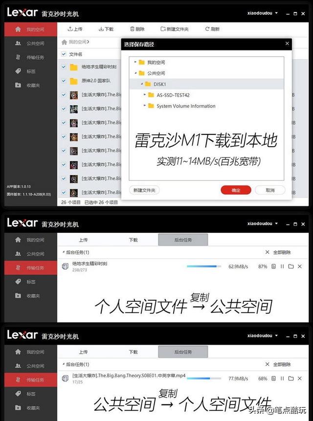 在PC客户端上我也做了文件管理、传输测试,比如将个人空间的文件下载到PC本地,再如将个人空间的文件复制到公共空间,后者相当于在M1挂载的移动固态硬盘内部做文件夹克隆,实测数十个大小不一的文件,平均速度在60~90MB/s左右。